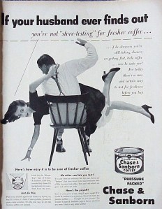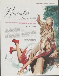 • But back to the men. Here’s one that reinforces the idea that men only like “ladies” and if you don’t act like one you might get spanked. I really like the positioning in this one and I’m sure the fact that she’s all in red is not coincidental. Women in red is a euphemism for naughty women who misbehave (often implying she’s ‘loose’ in sexual ways but not restricted to that. A good man reforming a naughty woman is the plot of about a million shows, movies, and books so clearly they liked the idea.)