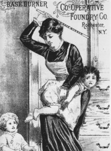 The ad here is for a baseburner stove. The old fashioned cast-iron type. So, they are drawing the connection to “base” as in your seat, and “burner” as in her mother is burning her butt.