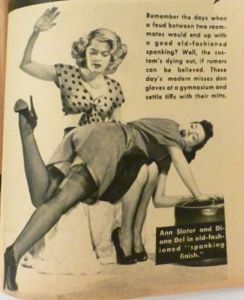 • Here’s another woman in charge scenario, although if you want to quibble this isn’t actually an ad, it’s an article about women trying out boxing, and appears to bring up spanking just to amuse male readers. (but on a personal note, that bare thigh just above the stockings…is there anything sexier?)