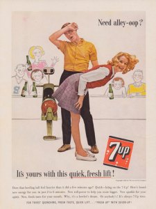 Just kidding, someone actually took this old ad for 7-UP and doctored it. (no idea who, but the real one is below.)It was actually a bowling ad, but it does look an awful lot like she’s asking for a spanking, right?