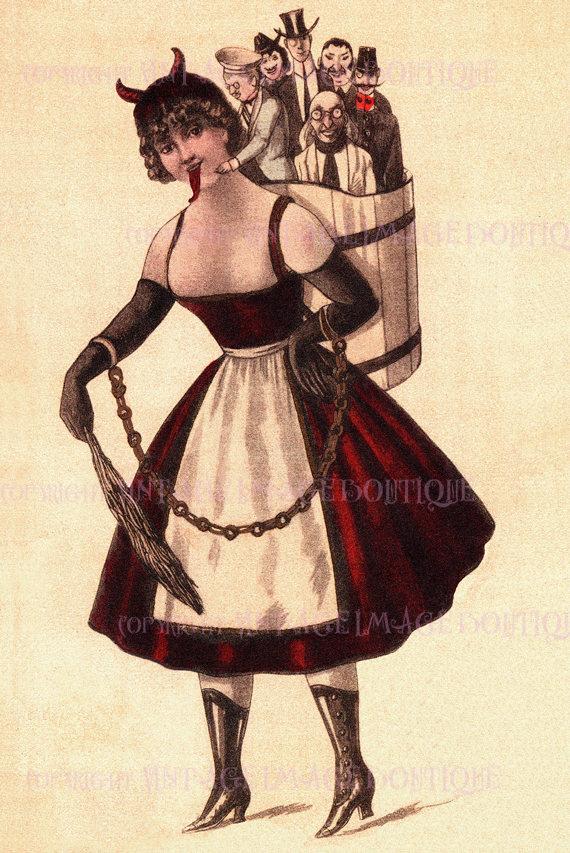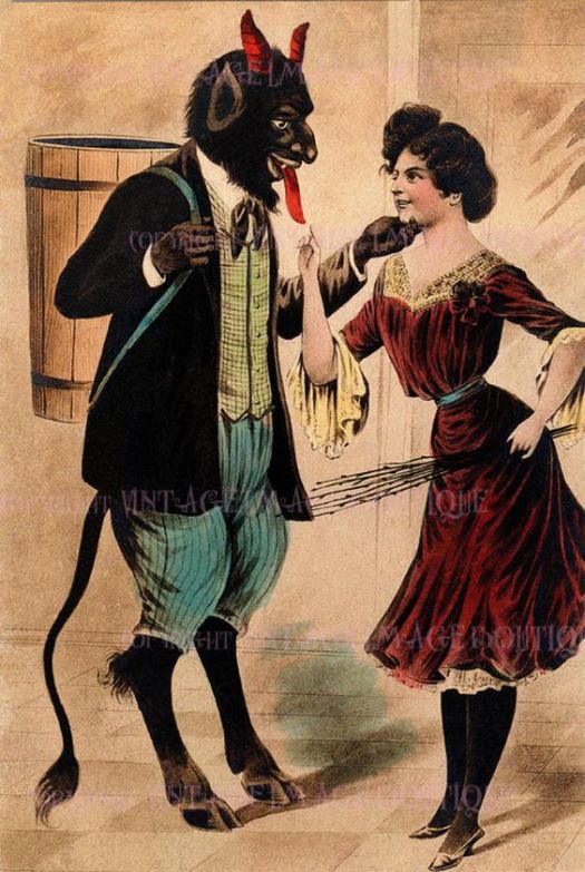 In keeping with the switch (heehee) we see a lot more adult themed Krampus lore showing up. And turn about is apparently fair play because female Krampuses started to appear in this art. Sexy lady Krampuses knew exactly how to handle rogues and cheating men. Though… they don’t seem to mind.