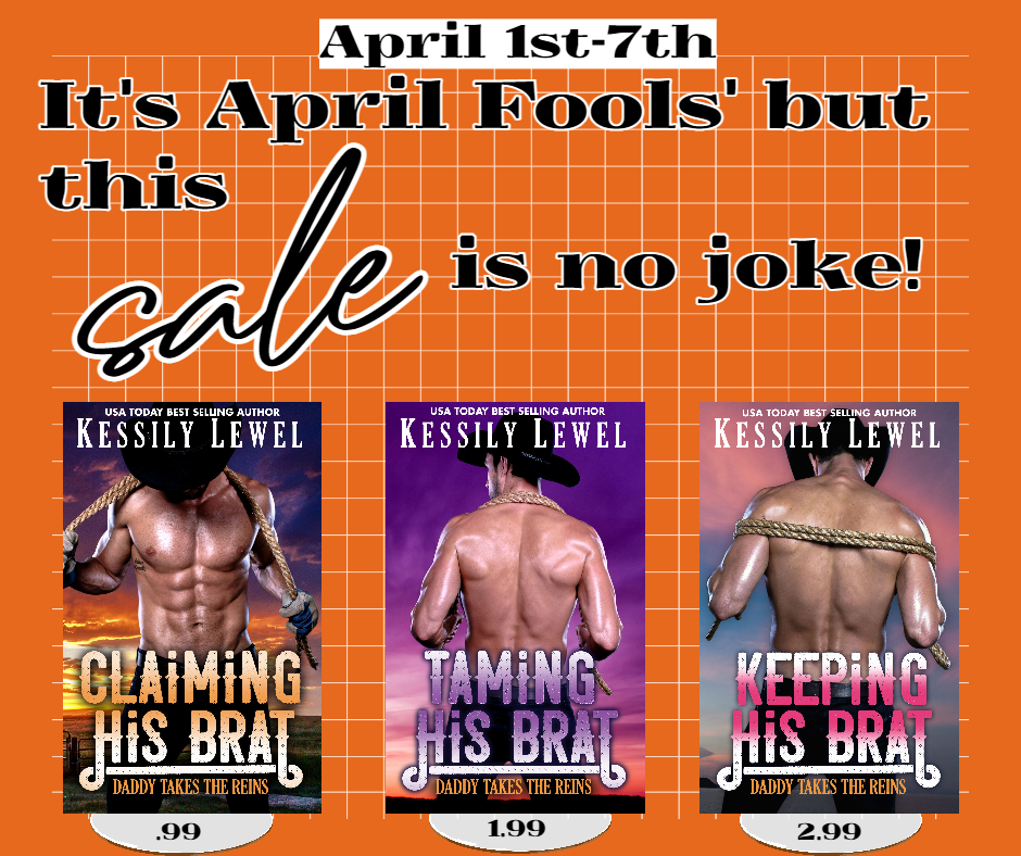 It’s April Fool’s but this is no joke! The first three books of the Daddy Takes the Reins series are on sale for the week. It’s the first time I’ve put all of these books on sale like this. Taming His Brat and Keeping His Brat have never been on sale since release.