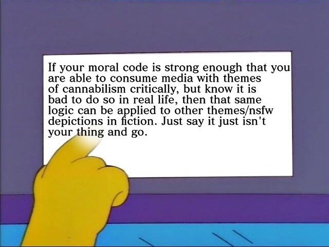The meme says “If your moral code is strong enough that you are able to consume media with themes of cannibalism critically, but know it is bad to do so in real life, then that same logic can be applied to other themes/nsfw depictions in fiction. Just say it isn’t your thing and go.”